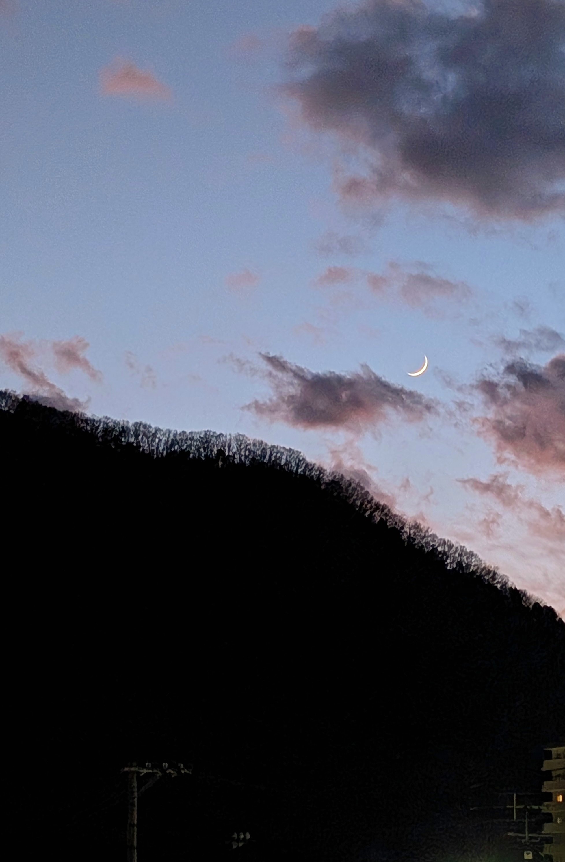 その時、ふと遠くの山にほそ~~い三日月が雲の合間から出ていました。